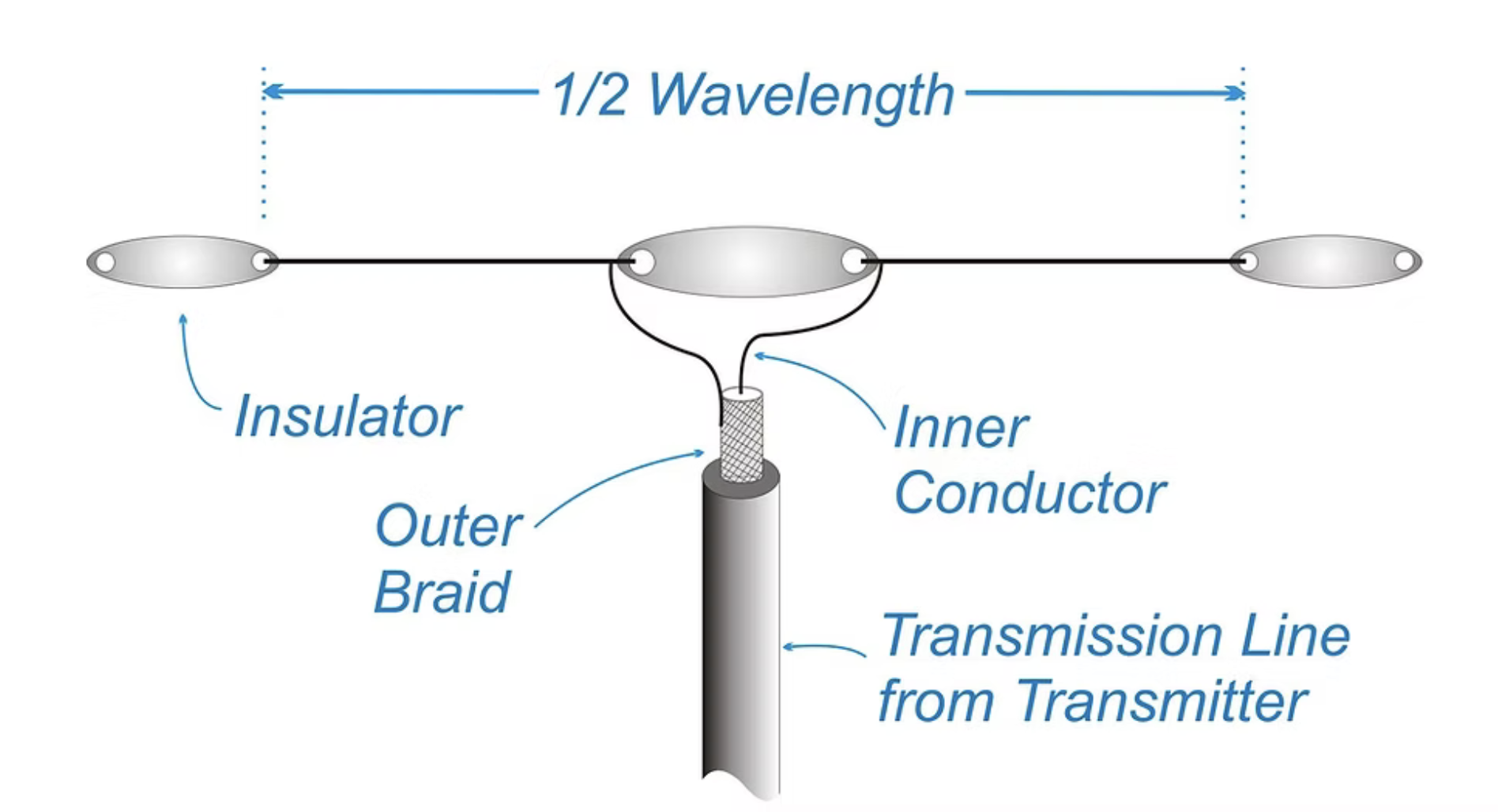 We are transmitting in the VHF band. For a given frequency \(f\), the free-space wavelength is: \[ \lambda = \frac{c}{f} \] For example, at \(f = 144\ \mathrm{MHz}\): \[ \lambda \approx 2.083\ \mathrm{m} \] Thus: \[ L_{\frac{\lambda}{2}} \approx 1.041\ \mathrm{m}, \quad L_{\frac{\lambda}{4}} \approx 0.520\ \mathrm{m} \] These lengths are starting points — real-world designs adjust them for velocity factor, material loading, and mounting conditions.